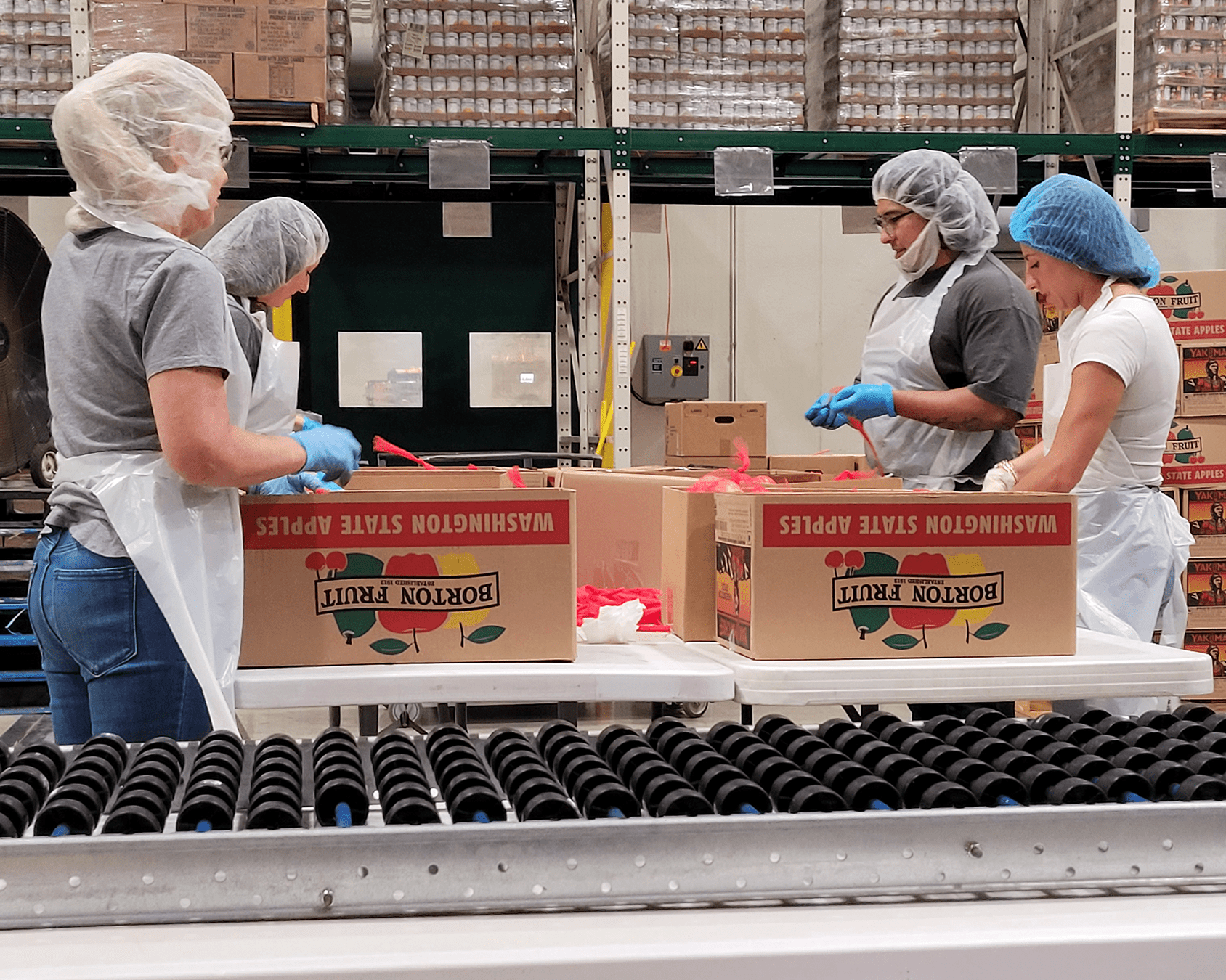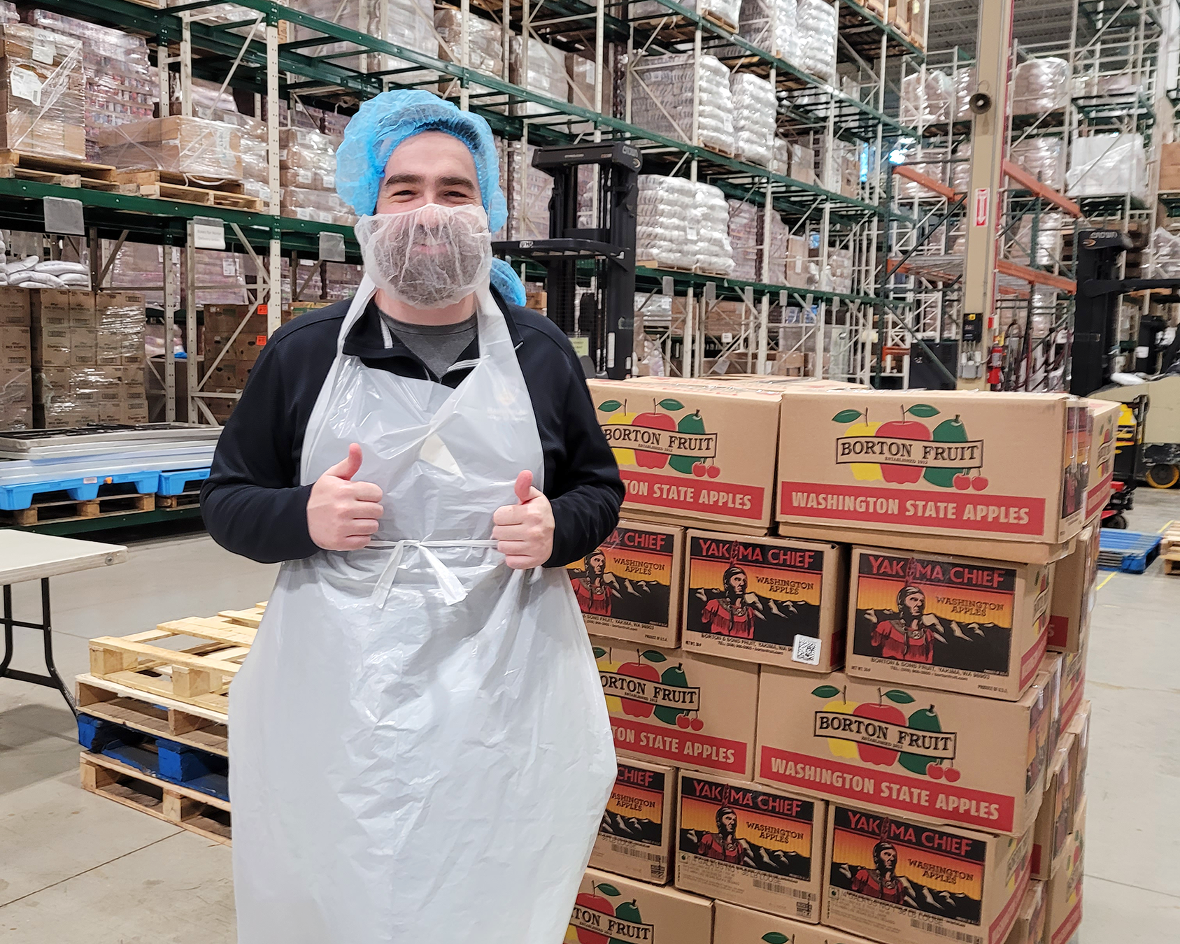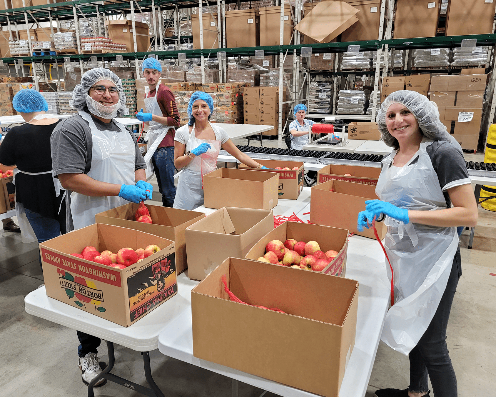 Our task was repackaging pallets of apples into family-sized portions, cutting net rope, and tying the end to make a bag. When assessing the impact of apple packing, the GCFD uses apple pies as a unit of measure, and our team packaged the equivalent of 263 pies per volunteer! That’s 126 cases of apples, or 4,410 pounds, resulting in 3,675 meals facilitated by our efforts in a single afternoon. It’s incredible to really see the significance of our efforts by the numbers!