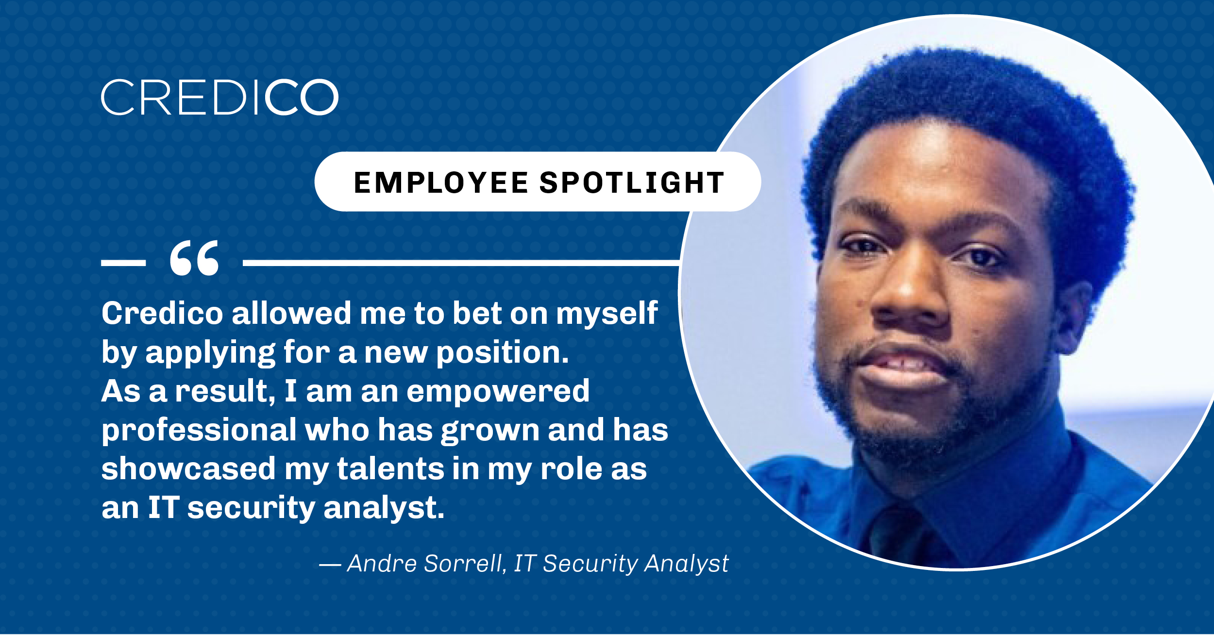 We’d like to introduce our next featured employee – Andre Sorrell, IT Security Analyst at Credico (USA) LLC. We discuss finding opportunities for growth, preparing to dive into them, and knowing you’ve got an amazing support system while you do.