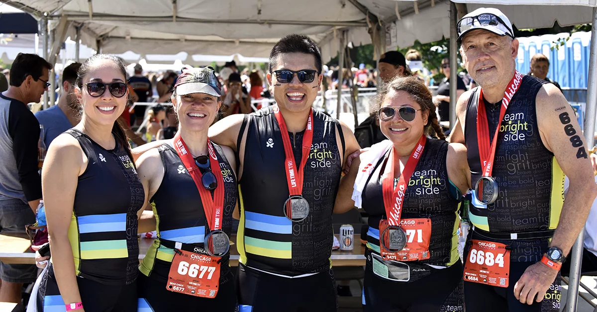 Since its first triathlon nine years ago, Team Bright Side has trained more than 570 athletes to compete in the endurance multi-sport race with a 100% completion rate. You can spot their distinctive striped kits crossing the finish line at an ever-expanding list of events including half and full Ironman races around the country, the NYC Triathlon, and the Kids Triathlon held the day before their signature event in Chicago.