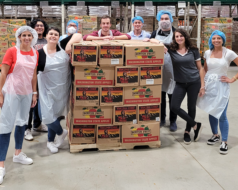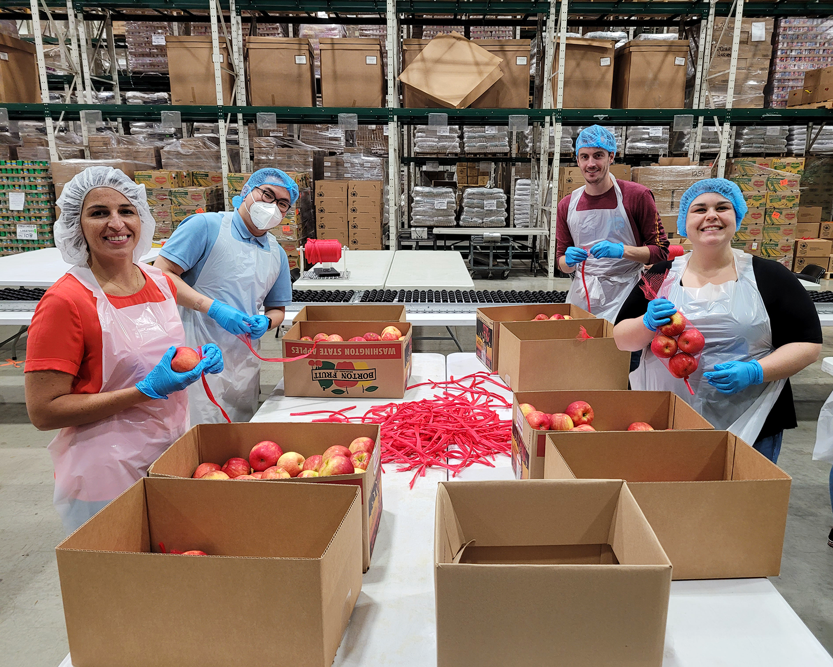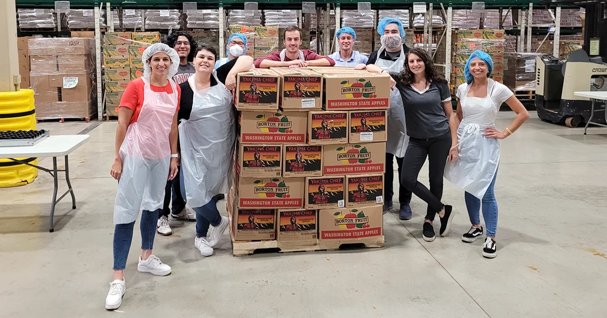 Our task was repackaging pallets of apples into family-sized portions, cutting net rope, and tying the end to make a bag. When assessing the impact of apple packing, the GCFD uses apple pies as a unit of measure, and our team packaged the equivalent of 263 pies per volunteer! That’s 126 cases of apples, or 4,410 pounds, resulting in 3,675 meals facilitated by our efforts in a single afternoon. It’s incredible to really see the significance of our efforts by the numbers!