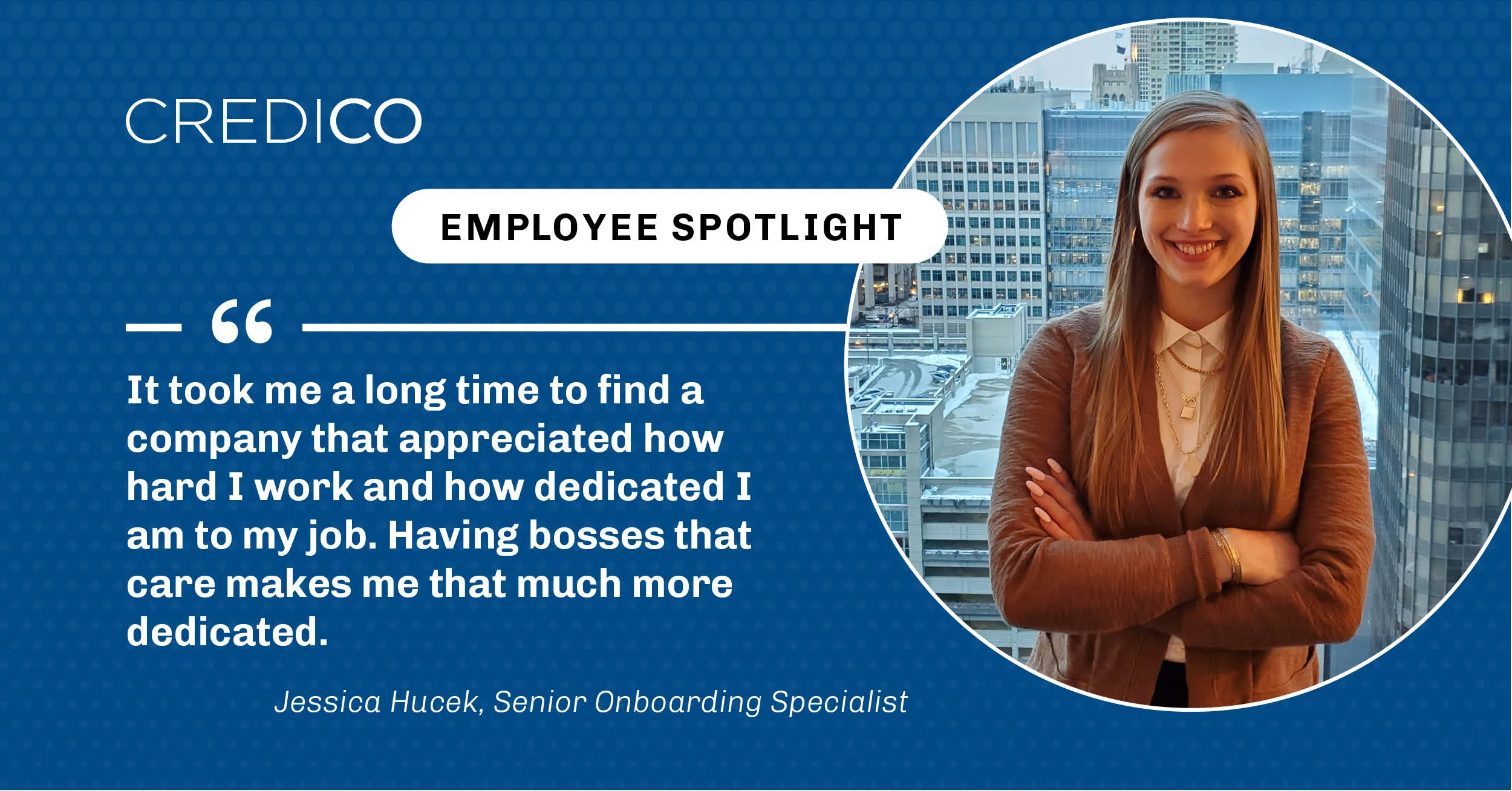 I love how my bosses, Erica and Neil, care about my growth and career path. I feel fortunate that they both have taken such an interest in making sure I move up and continue to excel at Credico; it took me a long time to find a company that appreciated how hard I work and how dedicated I am to my job and having bosses that care, makes me that much more dedicated.